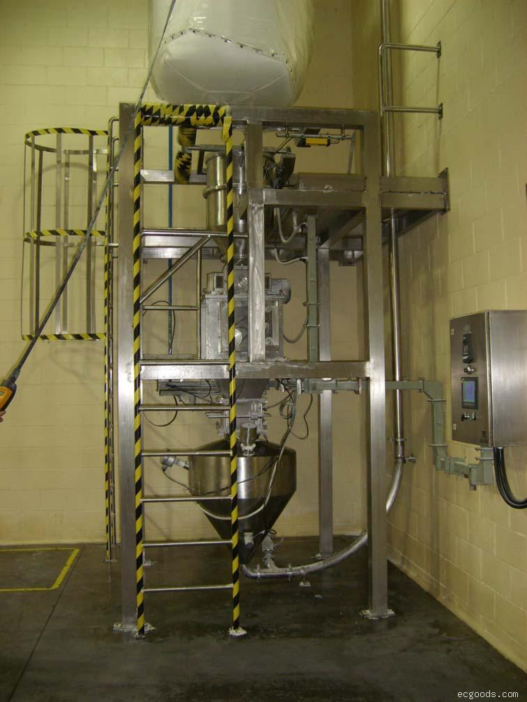 噸包拆包機卸載方式主要分為兩種:一種是大袋開袋后和大袋卸料站叉車將大袋(或噸袋)吊裝到卸料機的機架上,它本身不帶起重設備,二是大袋開袋站和大袋卸料站是靠自身的起重設備將大袋(或噸袋)吊裝到卸料機的機架上,不需要外界的幫助,它通過提升噸袋至設備進料口,人工拆開噸袋下料口,打開流量閥并附以拍打、振動、破碎等裝置,促使袋內的粉粒狀物料靠重力落進料倉來完成拆包卸料工作,整個過程是全自動控制,系統(tǒng)操作穩(wěn)定,能完成連續(xù)拆包的任務,操作過程簡單方便,通過相關實驗結果可知,拆完一包料的時間大約是5-6分鐘,領先于國內大多機械設備生產(chǎn)公司。